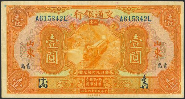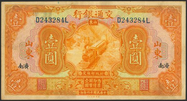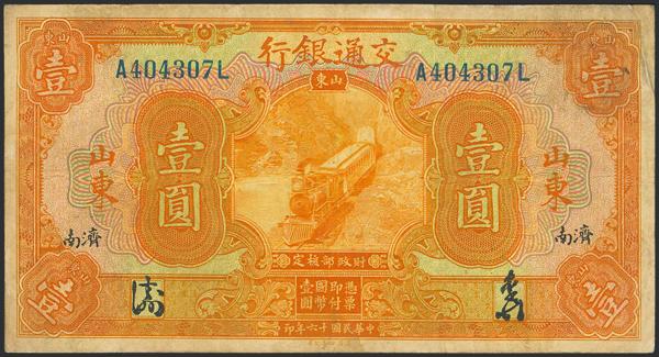 CHINA. 1 Yuan. 1 November 1927. Bank of Communications. Tsinan / Shantung. (Pick: 145Bf). Very Fine.