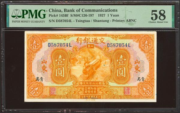 CHINA. 1 Yuan. 1 November 1927. Bank of Communications. Tsingtau / Shantung. (Pick: 145Bf, SM: C126-197). PMG58.