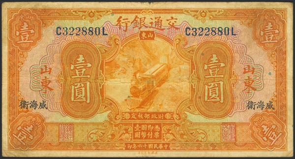 CHINA. 1 Yuan. 1 November 1927. Bank of Communications. Weihaiwei / Shantung. (Pick: 145Bg). Fine.