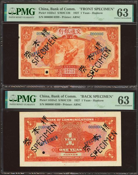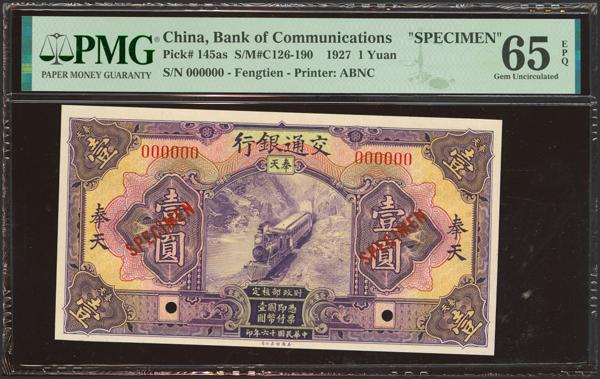 CHINA. 1 Yuan. 1 November 1927. Bank of Communications, Specimen. (Pick: 145Cs, SM: C126-200). PMG67EPQ (according to the PMG population report, it is the third highest qualified banknote as of 15 February 2025).