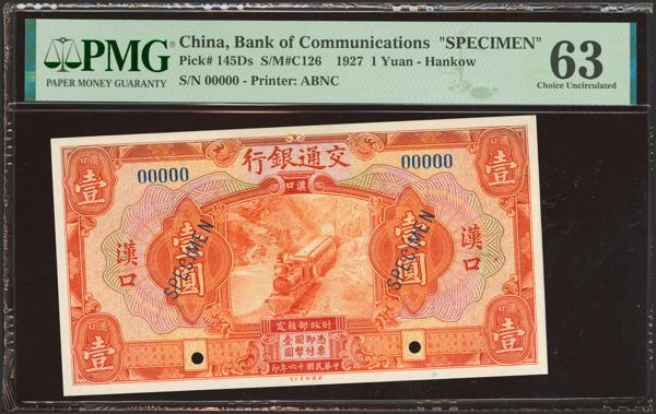 CHINA. 1 Yuan. 1 November 1927. Bank of Communications. Hankow. Specimen. (Pick: 145Ds, SM: C126). PMG63.