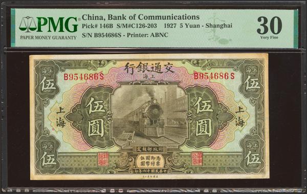 CHINA. 5 Yuan. 1 November 1927. Bank of Communication. Shanghai. (Pick: 146B, SM: C126-203). PMG30 (toned).