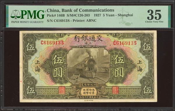 CHINA. 5 Yuan. 1 November 1927. Bank of Communication. Shanghai. (Pick: 146B, SM: C126-203). PMG35.