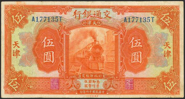 CHINA. 5 Yuan. 1 November 1927. Bank of Communication. Tientsin. (Pick: 146D). Very Fine.
