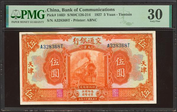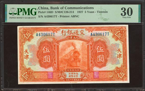 CHINA. 5 Yuan. 1 November 1927. Bank of Communication. Tientsin. (Pick: 146D, SM: C126-214). PMG30.