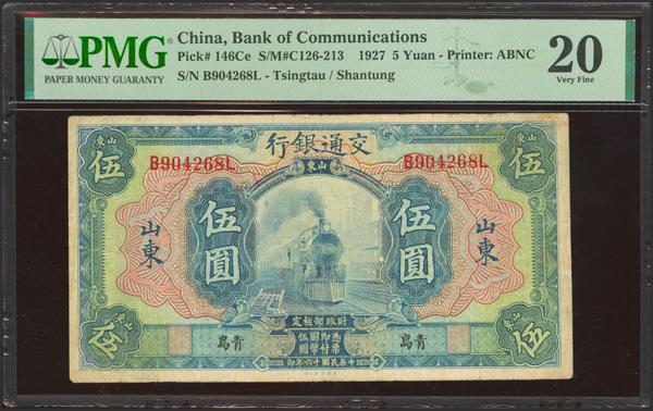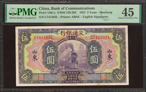 CHINA. 5 Yuan. 1 November 1927. Bank of Communication. Shantung. (Pick: 146Ca, SM: C126-204). PMG45.
