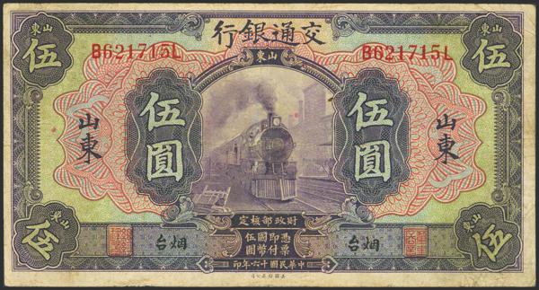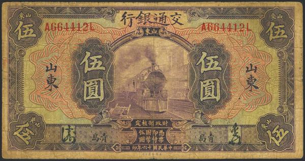 CHINA. 5 Yuan. 1 November 1927. Bank of Communication. Tsinan / Shantung. (Pick: 146Cd). Pinhole and tear. More than Very Fine.