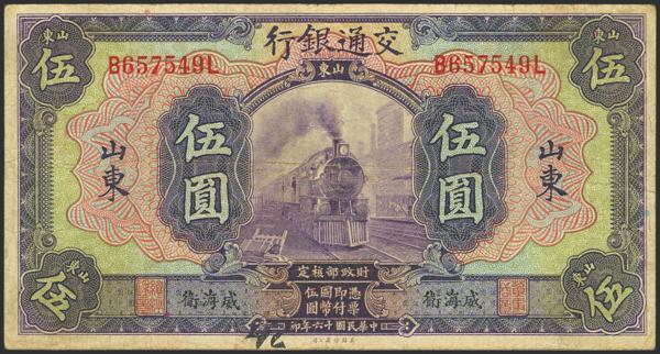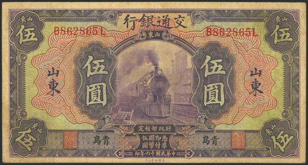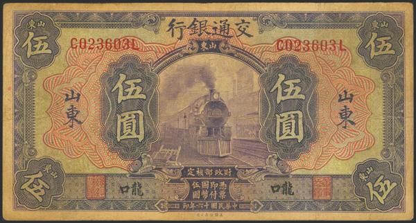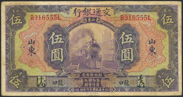 CHINA. 5 Yuan. 1 November 1927. Bank of Communication. Lungkow / Shantung. (Pick: 146Cc). Fine.
