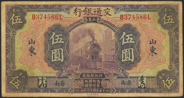 CHINA. 5 Yuan. 1 November 1927. Bank of Communication. Tsinan / Shantung. (Pick: 146Cd). Fine.