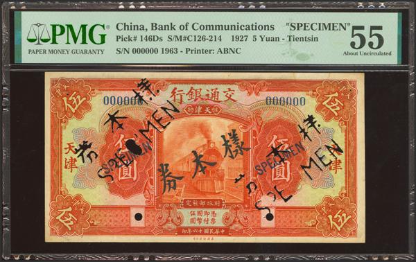 CHINA. 5 Yuan. 1 November 1927. Bank of Communication. Tientsin. Front Specimen. (Pick: 146Ds, SM: C126-214). PMG55 (stains, pinholes).
