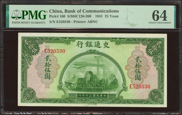 CHINA. 25 Yuan. 1941. Bank of Communication. (Pick: 160, SM: C126-260). PMG64.