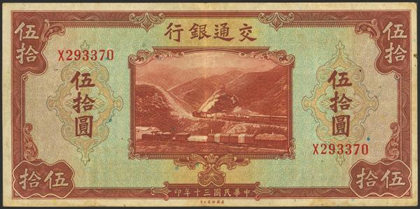 CHINA. 50 Yuan. 1941. Bank of Communication. (Pick: 161b). Dirty. Very Fine.