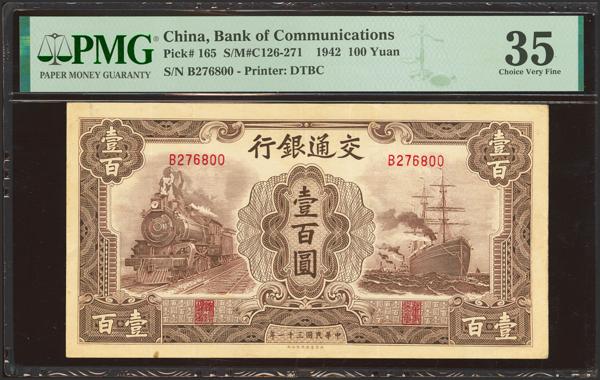 CHINA. 100 Yuan. 1942. Bank of Communication. (Pick: 165, SM: C126-271). PMG35 (minor paper pull).