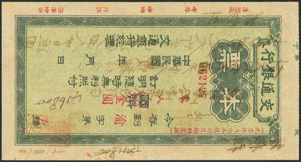 CHINA. No denomination. 1947. Bank of Communication. (Pick: Unlisted). More than Extremely Fine.
