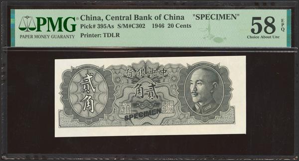 CHINA. 20 Cents. 1946. Central Bank of China. Specimen. (Pick: 395As, SM: C302). PMG58EPQ.