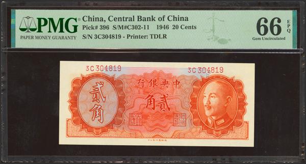 CHINA. 20 Cents. 1946. Central Bank of China. (Pick: 396, SM: C302-11). PMG66EPQ.