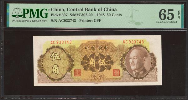 CHINA. 50 Cents. 1948. Central Bank of China. (Pick: 397, SM: C302-20). PMG65EPQ.