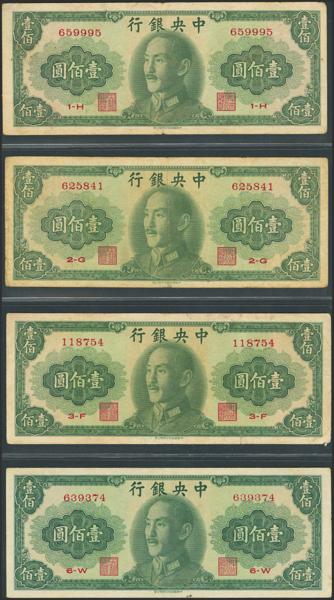 CHINA. Lot of 4 notes of 100 Yuan. 1948. Central Bank of China. (Pick: 406). Fine to Very Fine.