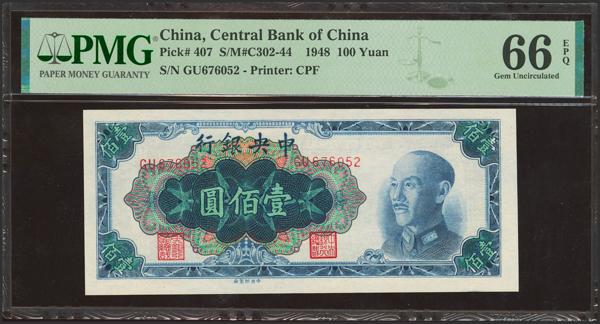 CHINA. 100 Yuan. 1948. Central Bank of China. (Pick: 407, SM: C302-44). PMG66EPQ.