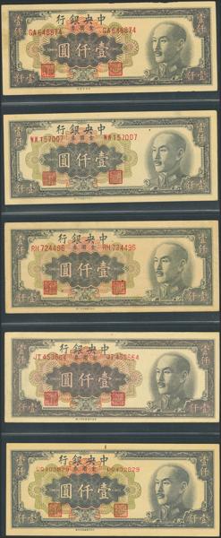 CHINA. Lot of 5 notes of 1000 Yuan. 1949. Central Bank of China. All sub-references of the reference. (Pick: 412a, 412b, 412c, 412d, 412E). Very Fine to About Uncirculated.