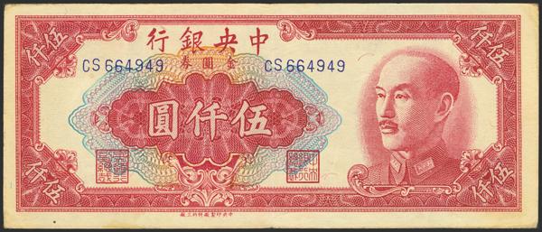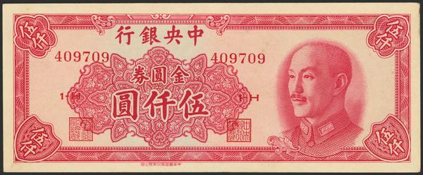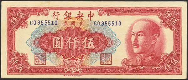 CHINA. 5000 Gold Yuan. 1949. Central Bank of China. 9 characters in the printer's name. (Pick: 415b). More than Very Fine.