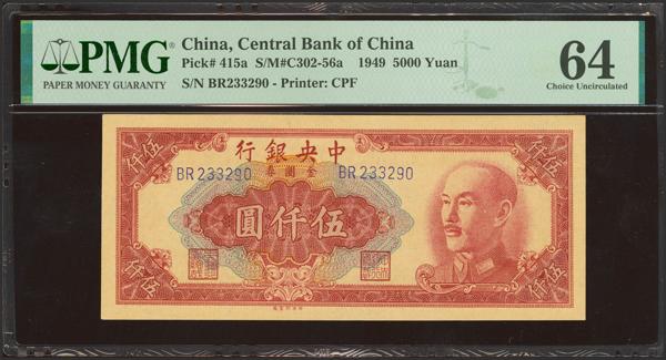 CHINA. 5000 Gold Yuan. 1949. Central Bank of China. 5 characters in the printer's name. (Pick: 415a, SM: C302-56a). PMG64
