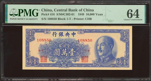 CHINA. 10000 Gold Yuan. 1949. Central Bank of China. (Pick: 416, SM: C302-61). Rust on top edge. PMG64.