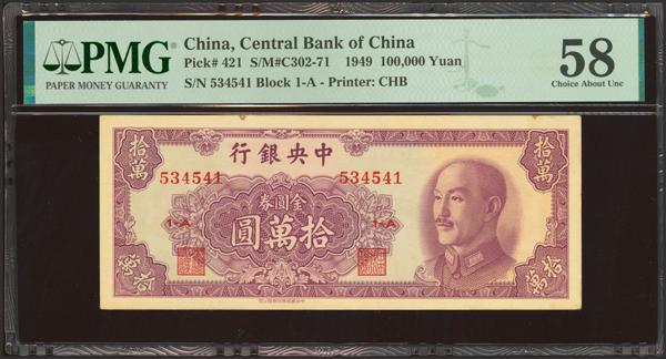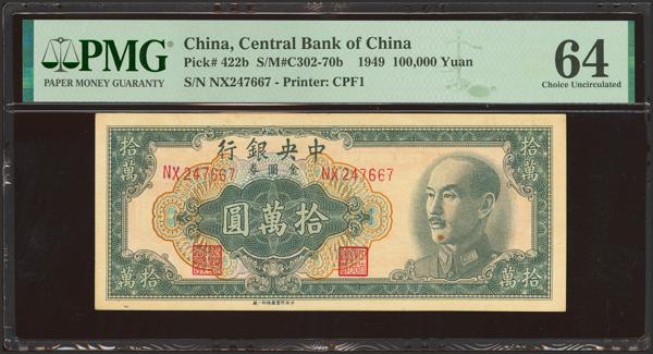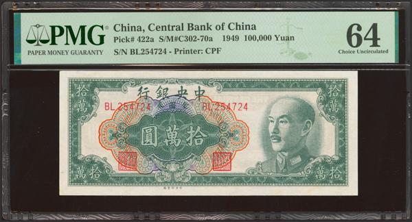 CHINA. 100000 Gold Yuan. 1949. Central Bank of China. (Pick: 422b, SM: C302-70b). PMG64 (as made inclusion).