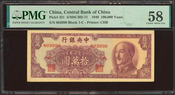 CHINA. 100000 Gold Yuan. 1949. Central Bank of China. (Pick: 421, SM: C302-71). PMG58.