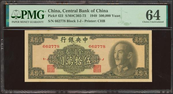 CHINA. 500000 Gold Yuan. 1949. Central Bank of China. (Pick: 423, SM: C302-73). PMG64.