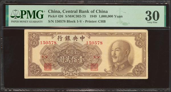 CHINA. 1000000 Gold Yuan. 1949. Central Bank of China. (Pick: 426, SM: C302-75). PMG30 (minor stains).