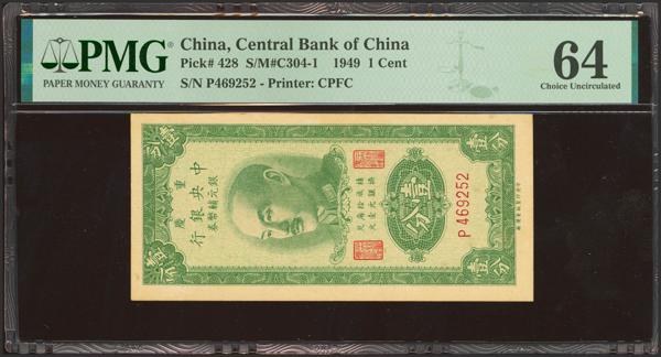 CHINA. 1 Cent. 1949. Central Bank of China. (Pick: 428, SM: C304-1). Paper wrinkles. PMG64