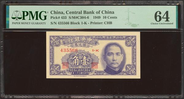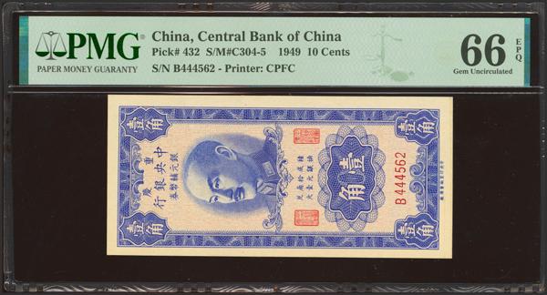 CHINA. 10 Cents. 1949. Central Bank of China. (Pick: 433, SM: C304-6). PMG64.