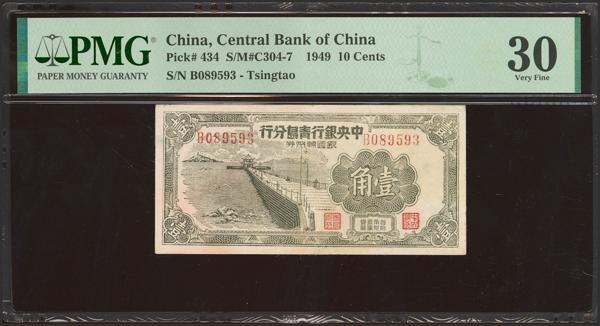 CHINA. 10 Cents. 1949. Central Bank of China. Tsingtao Branch. (Pick: 434, SM: C304-7). PMG30 (minor repairs, stains).