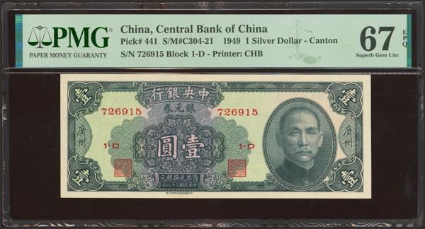 CHINA. 1 Silver Dollar. 1949. Central Bank of China. Canton. (Pick: 441 SM: C304-21). PMG67EPQ (according to the PMG population report, it is the Top Pop banknote as of 15 February 2025).