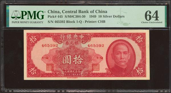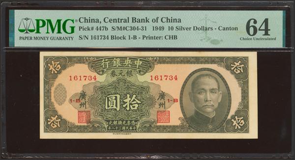 CHINA. 10 Silver Dollars. 1949. Central Bank of China. Canton. (Pick: 447b, SM: C304-31). PMG64.
