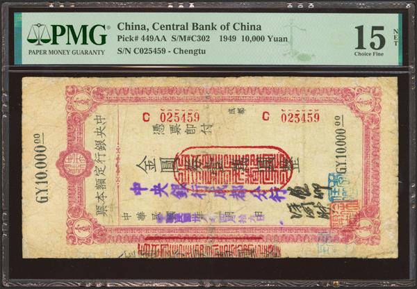 CHINA. 10000 Gold Yuan. 1949. Central Bank of China. Circulating Cashier’s Check. Chengtu. (Pick: 449AA, SM: C302). Restored. PMG15NET (repaired).