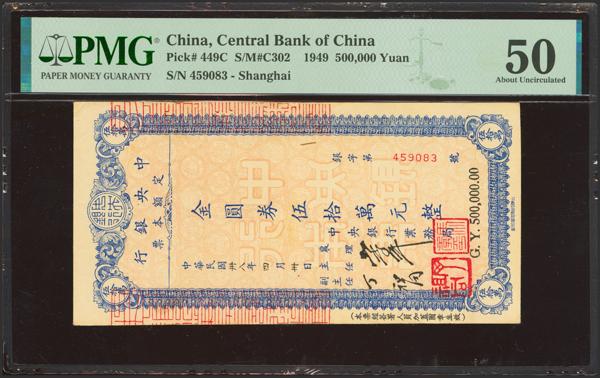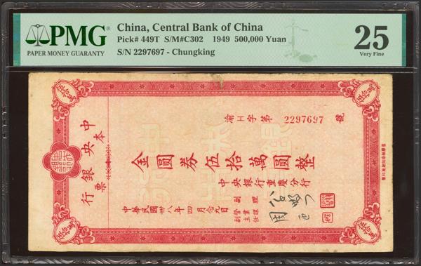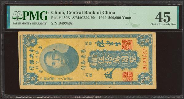 CHINA. 500000 Gold Yuan. 1949. Central Bank of China. Foochow. (Pick: 450N, SM: C302-90). PMG45 (minor rust).