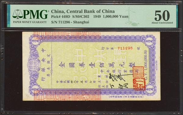 CHINA. 1000000 Gold Yuan. 1949. Central Bank of China. Circulating Cashier’s Check. Shanghai. (Pick: 449D, SM: C302). PMG50.