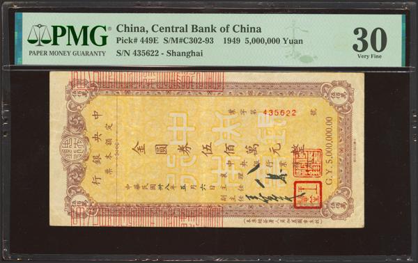 CHINA. 5000000 Gold Yuan. 1949. Central Bank of China. Circulating Cashier’s Check. Shanghai. (Pick: 449E, SM: C302-93). PMG30.
