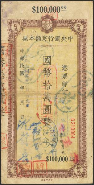 CHINA. 100000 Gold Yuan. 1948. Central Bank of China. Circulating Cashier’s Check. ChangChung. (Pick: 449G). Tap added. Fine.