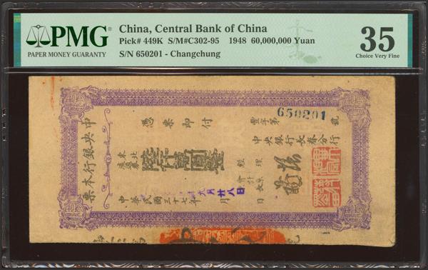 CHINA. 60000000 Gold Yuan. 1948. Central Bank of China. Circulating Cashier’s Check. Changchung. (Pick: 449K, SM: C302-95). PMG35.