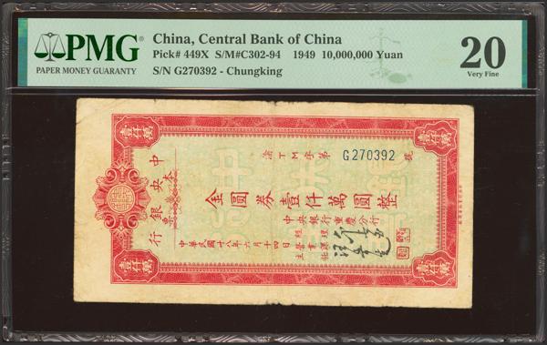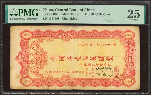 CHINA. 1000000 Gold Yuan. 1949. Central Bank of China. Circulating Cashier’s Check. Chungking. (Pick: 449U, SM: C302-91). PMG25 (stains).