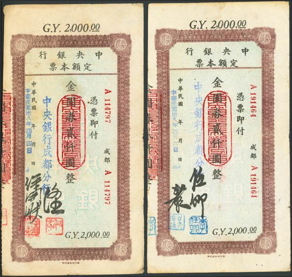 CHINA. Lot of 2 notes of 2000 Gold Yuan. 1948. Central Bank. Chengtu Bank. (Pick: 449Y). Very Fine.