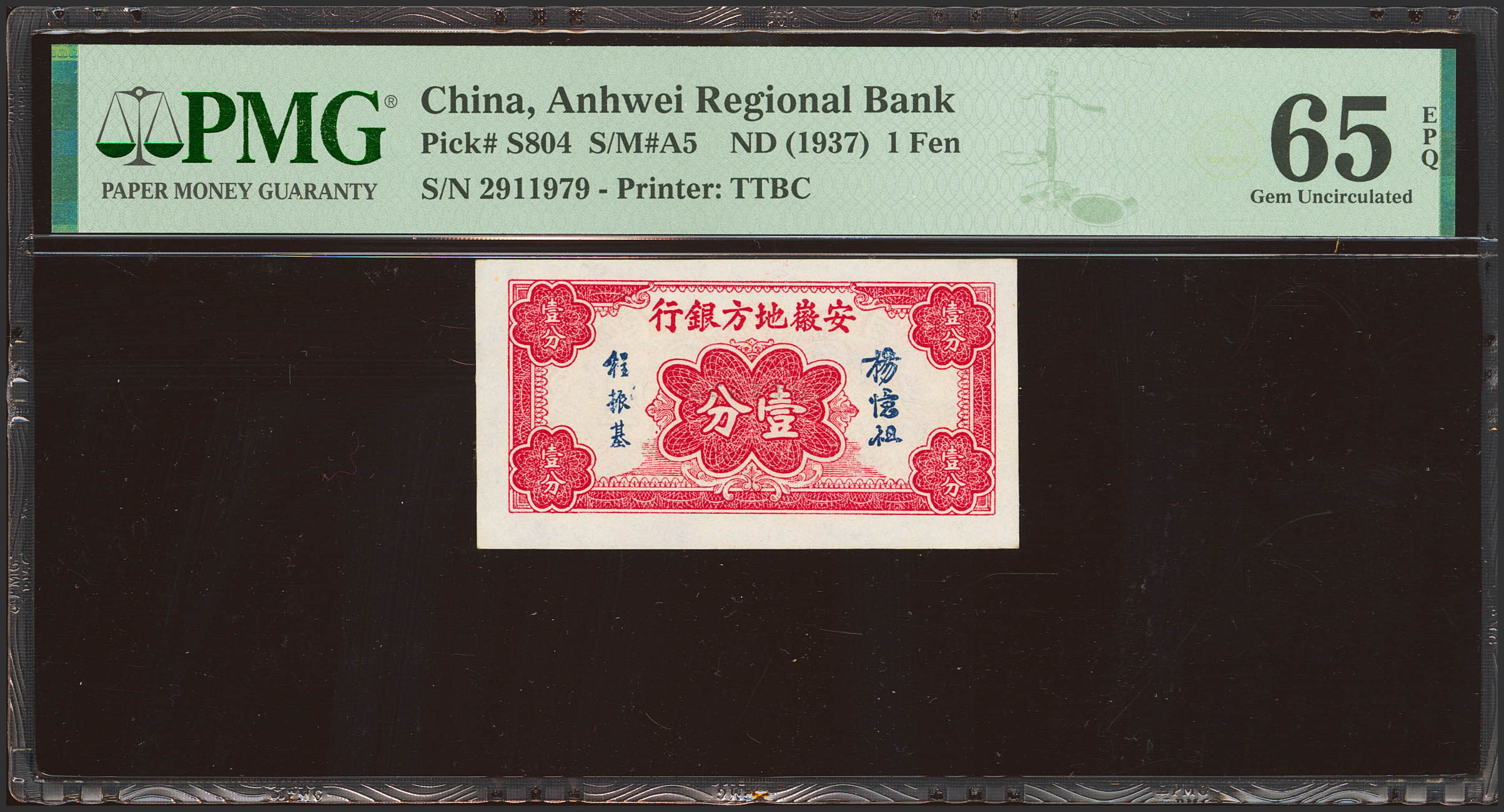 CHINA. 1 Fen. (1937ca). Anhwei Regional Bank. (Pick: S804 SM: A5). PMG65EPQ.