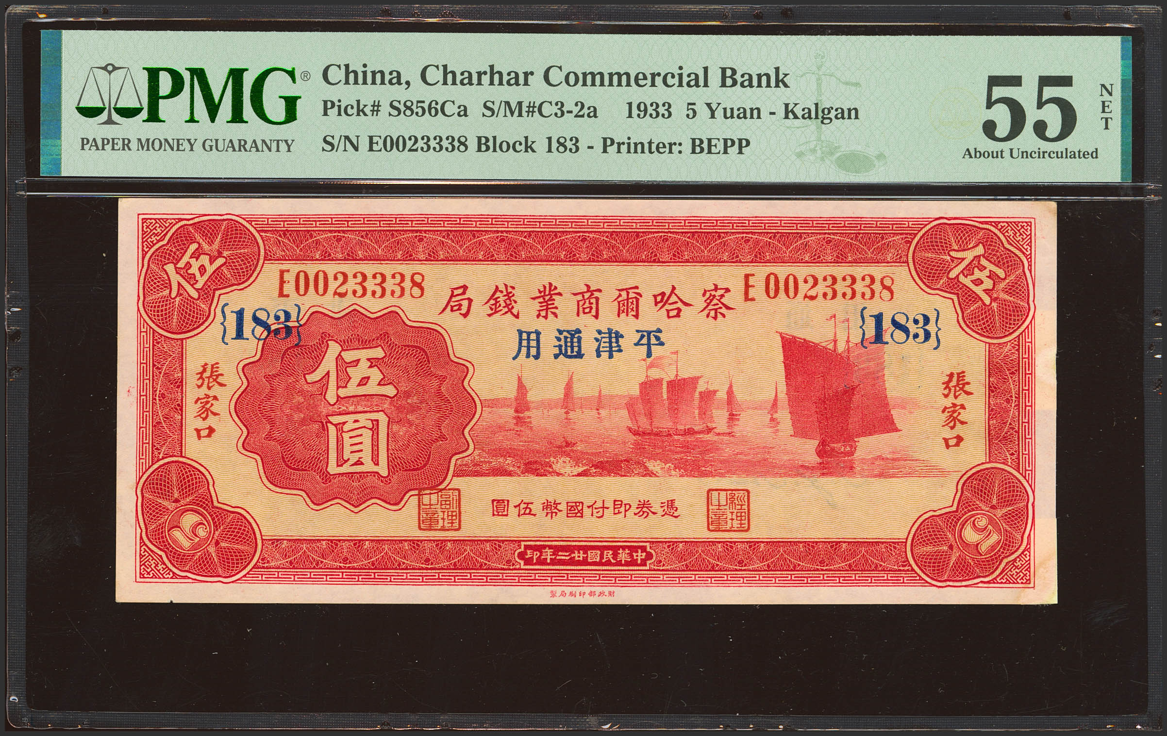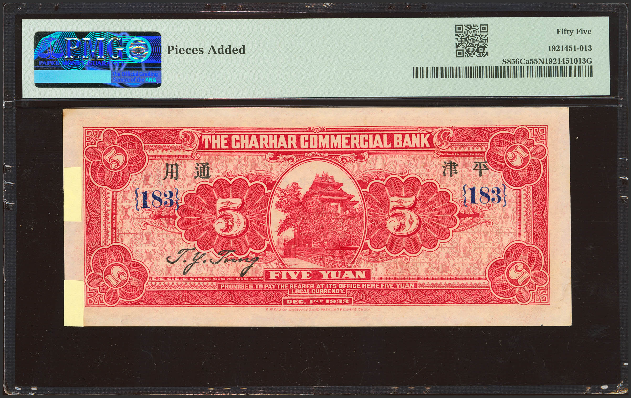CHINA. 5 Yuan. 1 December 1933. Charhar Commercial Bank. Kalgan. (Pick: S856Ca, SM: C3-2a). PMG55NET (pieces added).