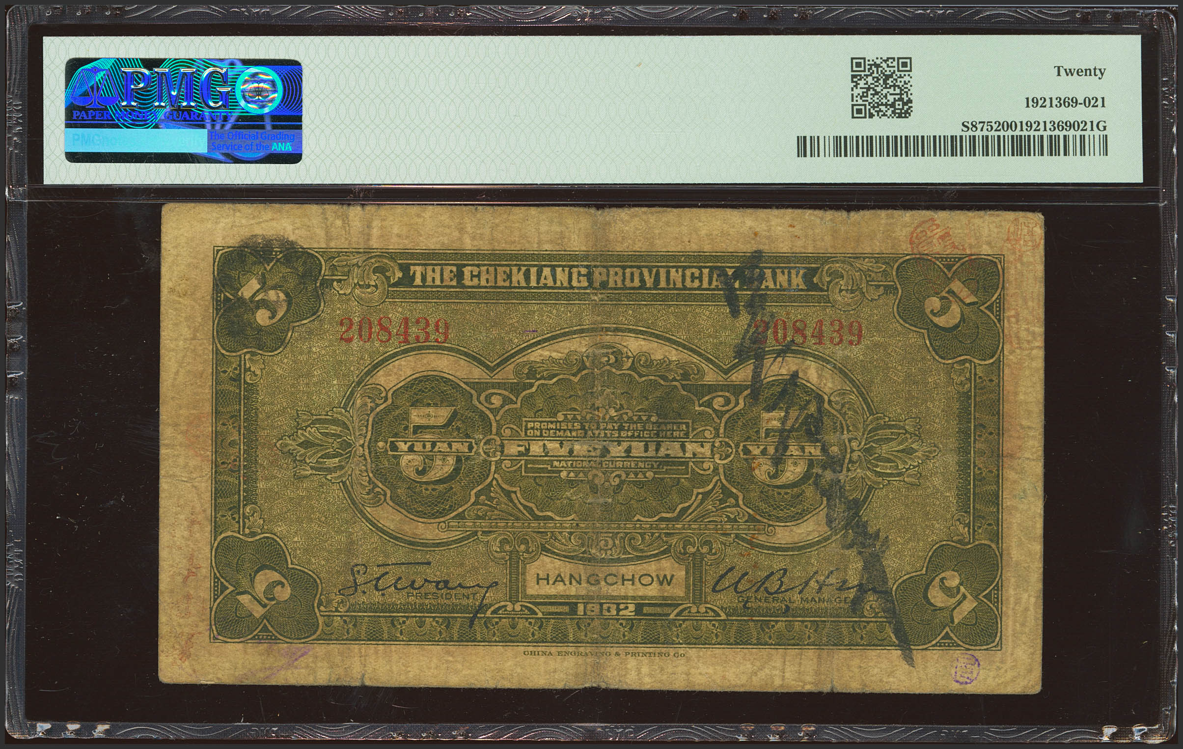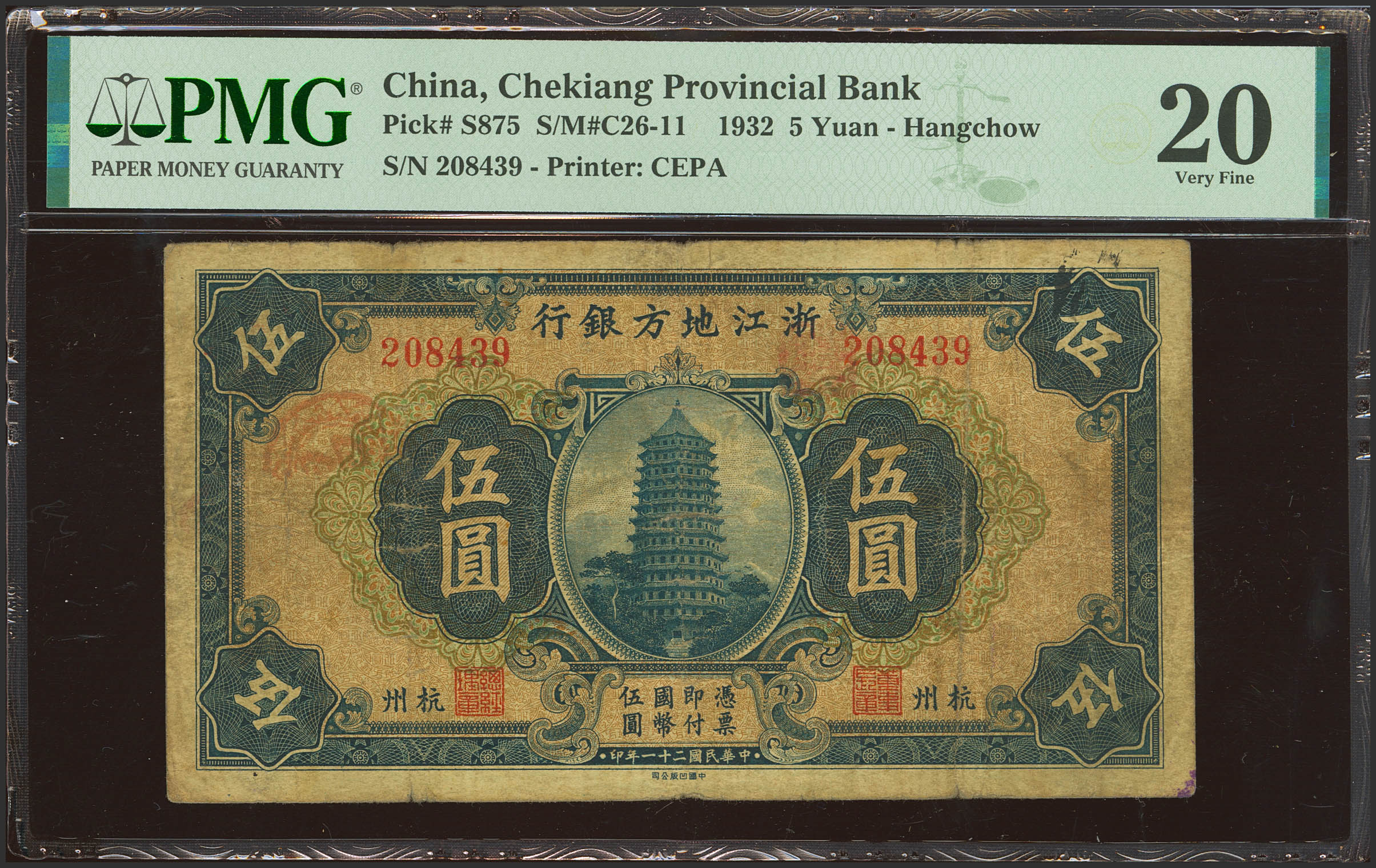 CHINA. 5 Yuan. 1932. Chekiang Provincial Bank. Hangchow. (Pick: S875, SM: C26-11). PMG20.