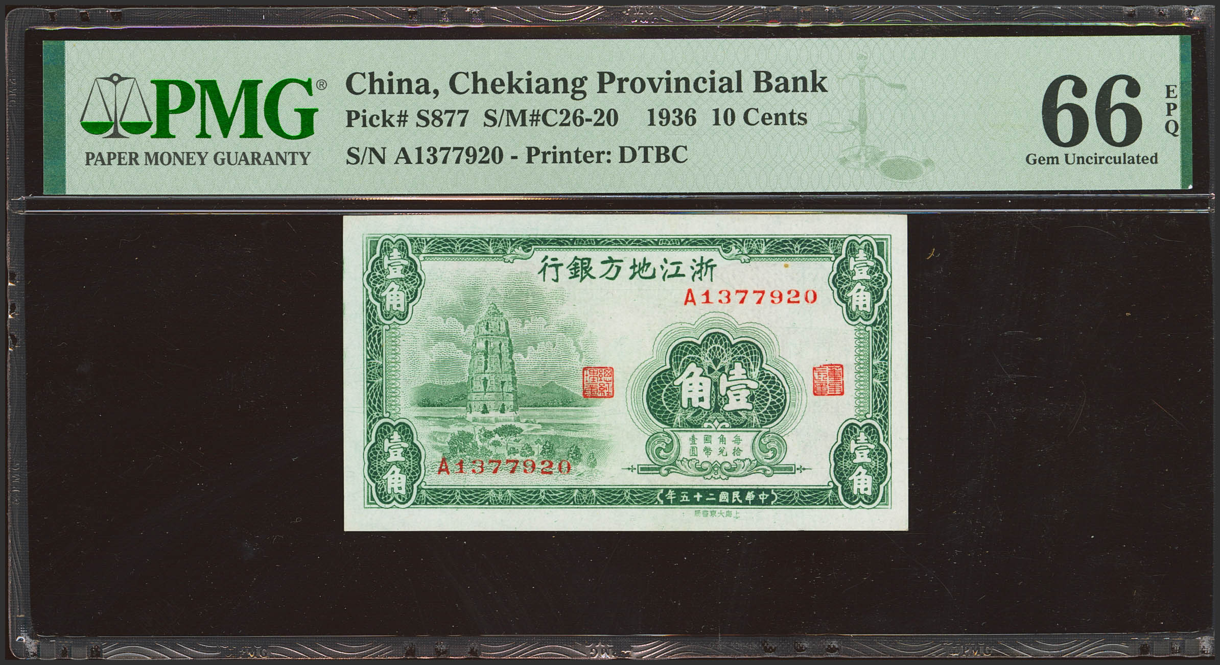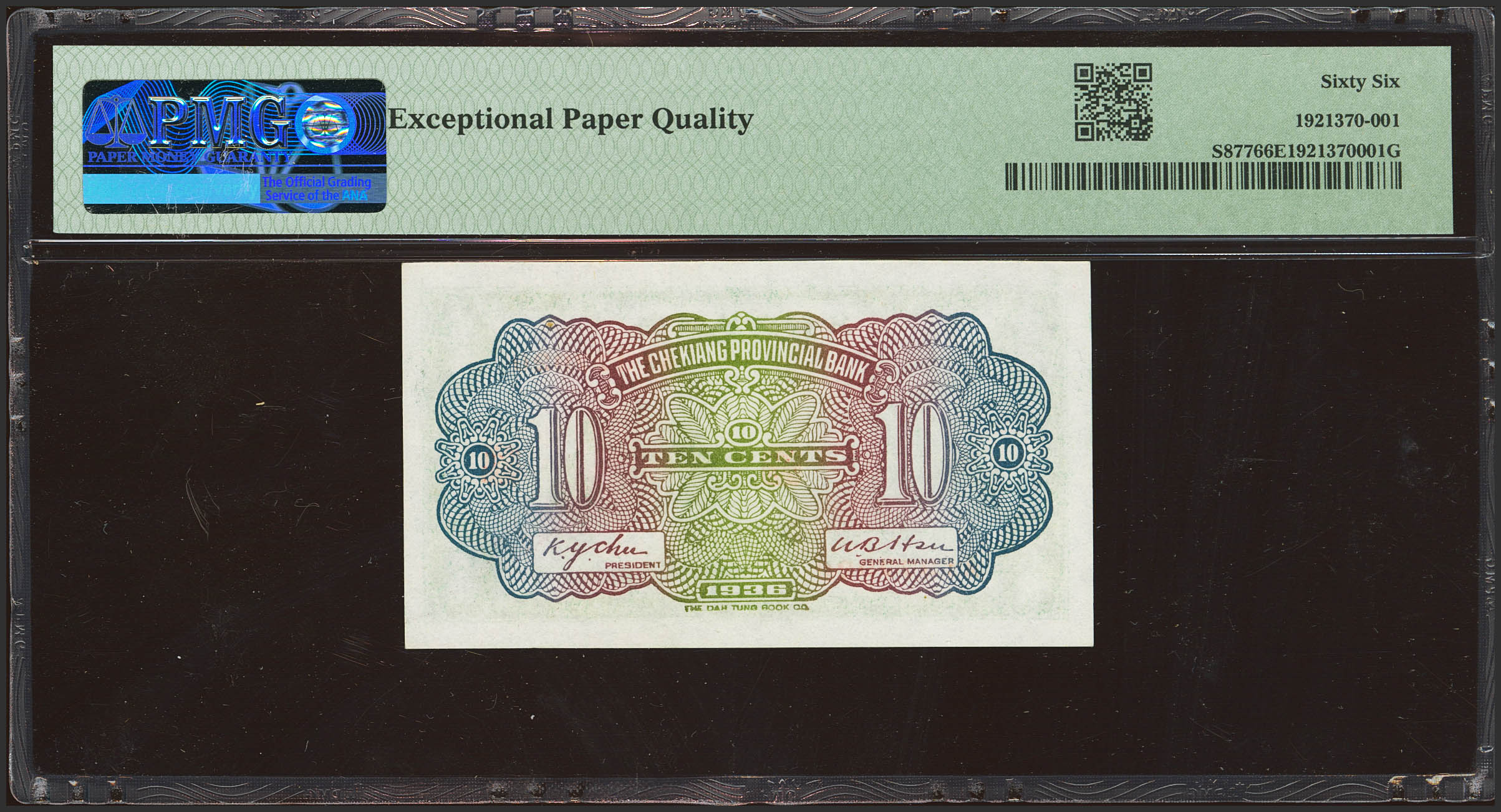 CHINA. 10 Cents. 1936. Chekiang Provincial Bank. (Pick: S877, SM: C26-20). PMG66EPQ.