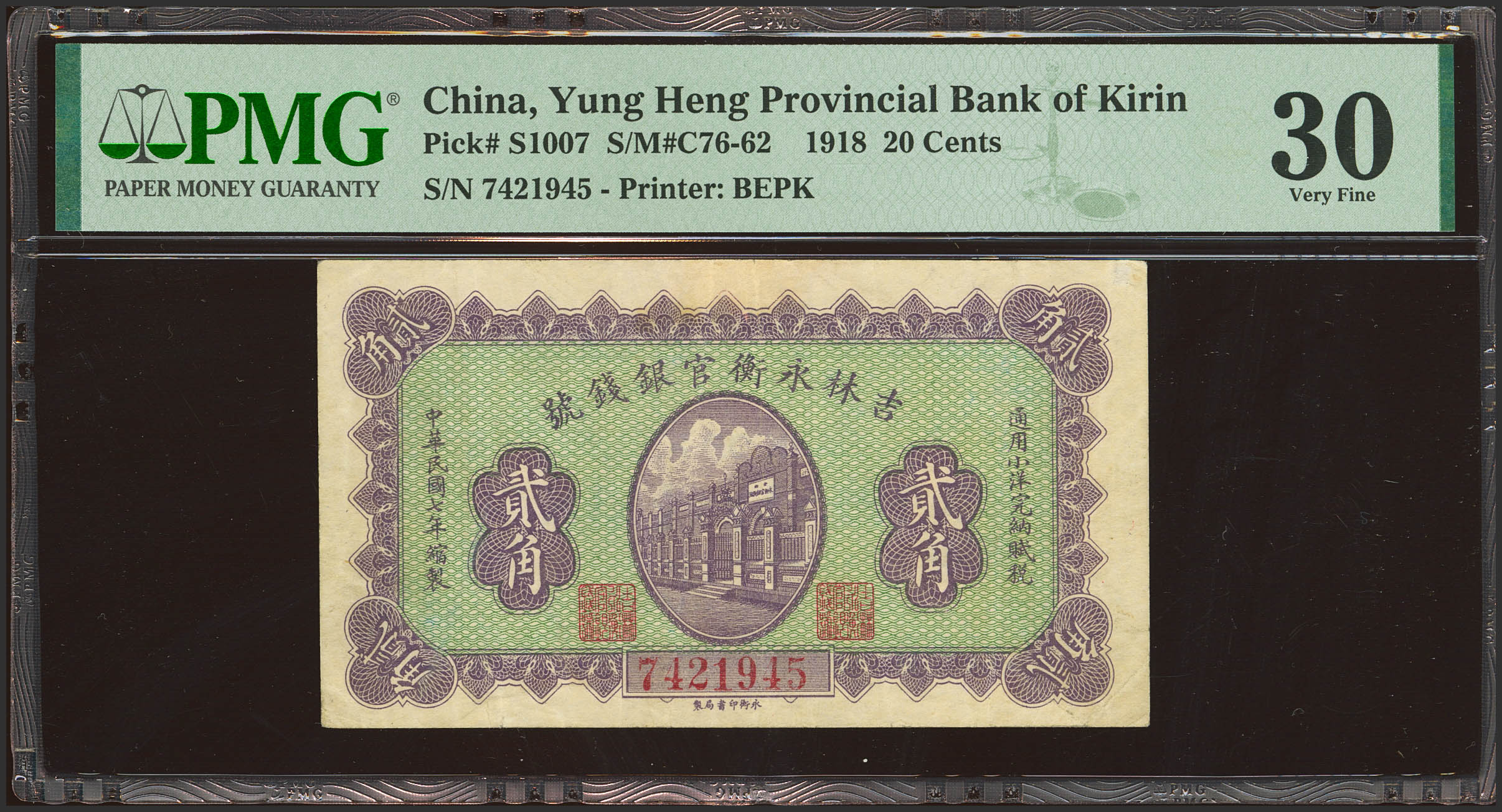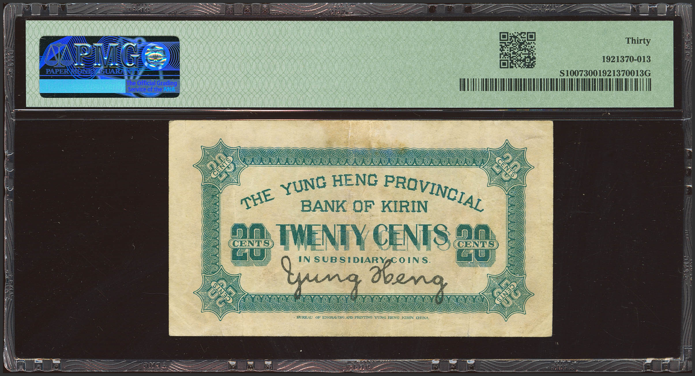 CHINA. 20 Cents. 1918. Yung Heng Provincial Bank of Kirin. (Pick: S1007. SM: C76-62). PMG30.