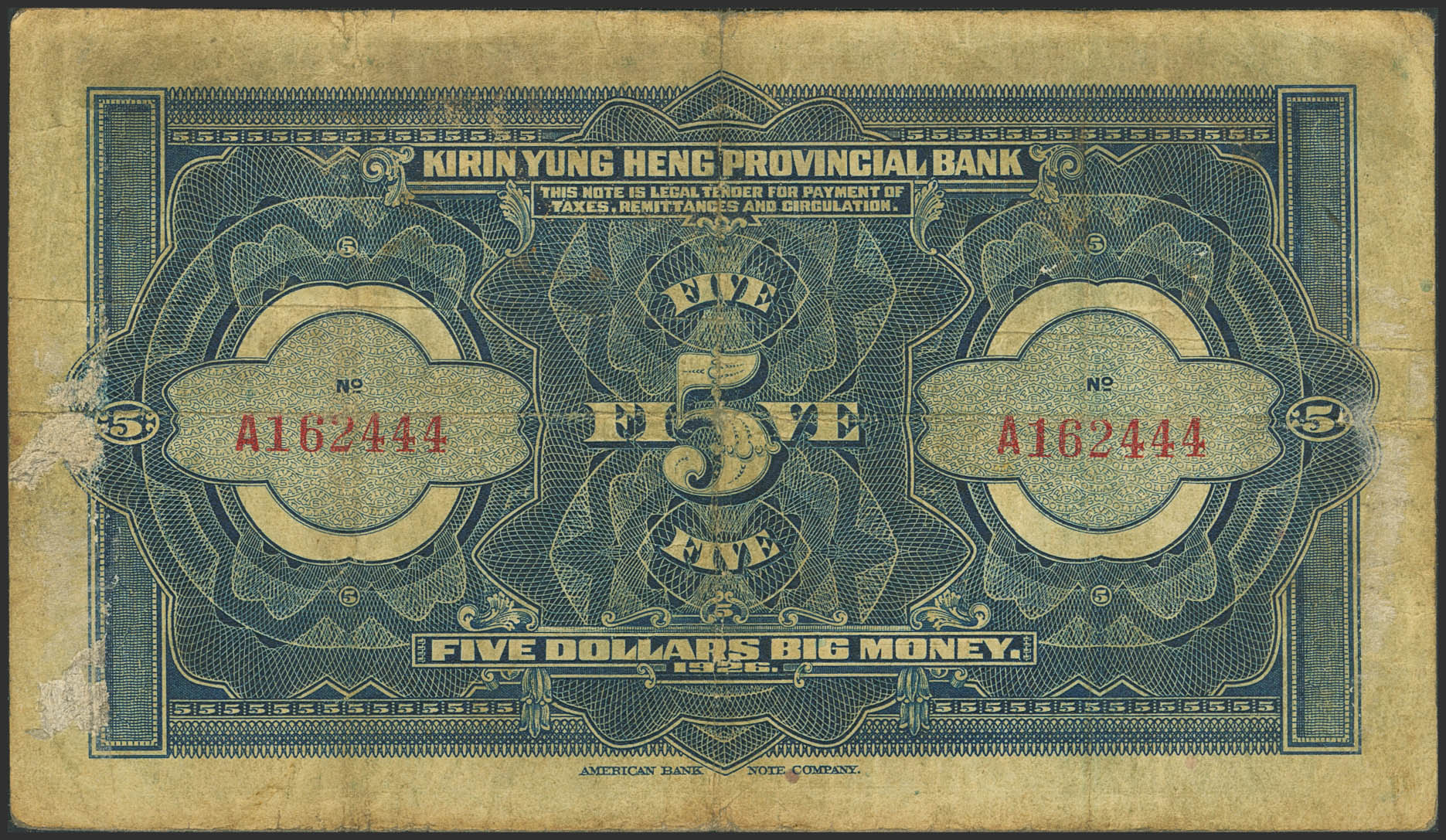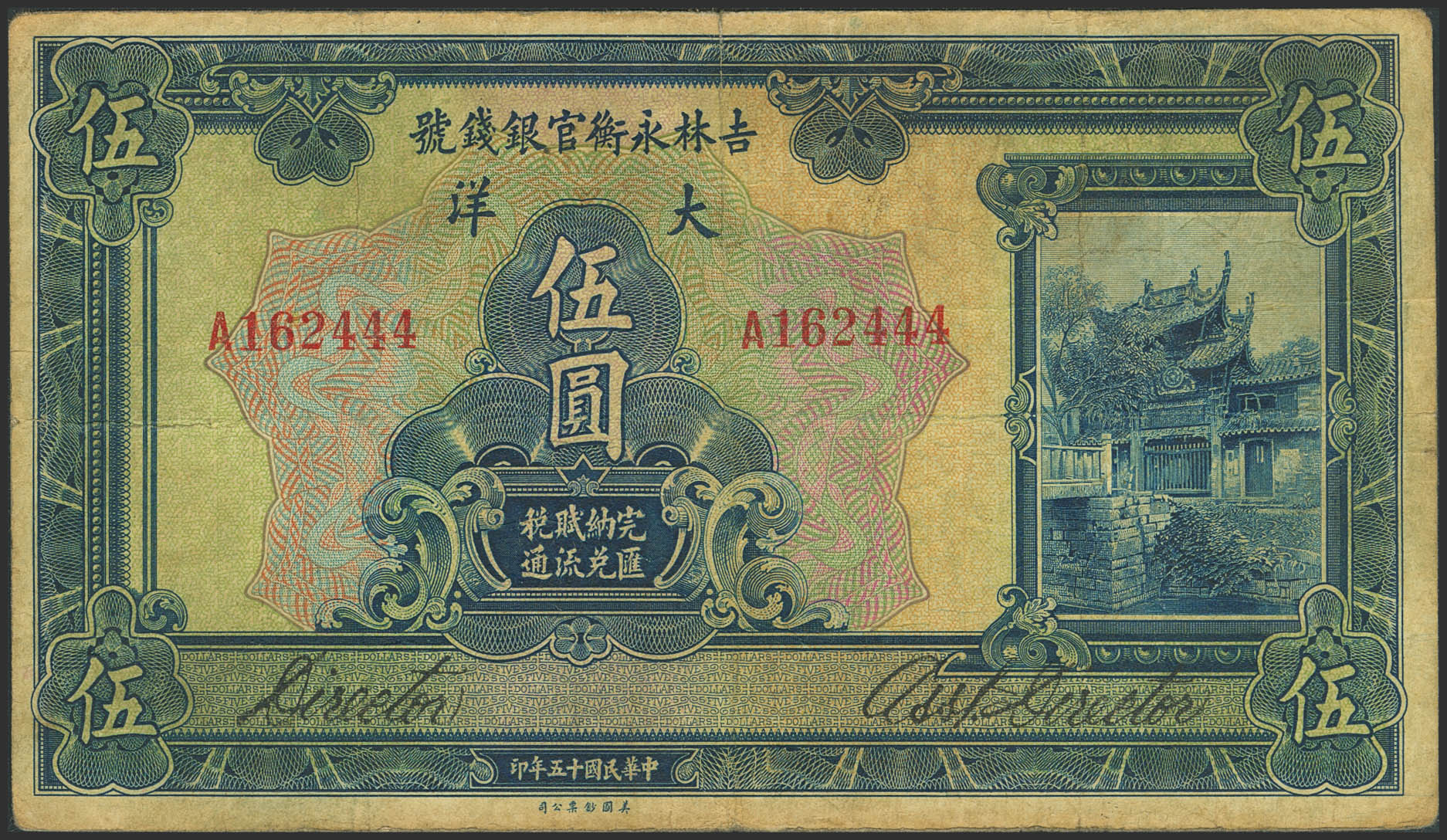CHINA. 5 Dollars. 1926. Kirin Yung Heng Provincial Bank. (Pick: S1067). Fine.